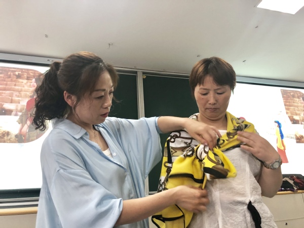 阶东1-1教室里,报名参加将“百变丝巾”互动的四十多位市民,在老师的指导下将丝巾折成百样式,不仅增加了它的美观度,而且还增加了它的用途,有披风式的、有手链式的、有头巾式的,还有制成腰带和背包式的。市民姜樟凤是我校第四期金牌月嫂培训班学员,刚刚结束了上海的单,听说我校开放日有“百变丝巾”的互动就赶紧报了名,“我们在上海等地做月嫂,走出去就是衢州的形象,衢职院在教会我们技能的同时,也教我们自我形象的塑造。”