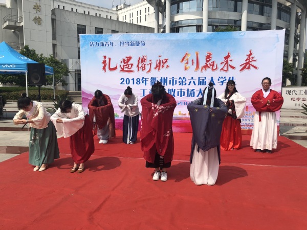 汉服社、兰亭书协、手工协会、武术协会等学生社团展现了中华传统文化社团的刚柔与雅美。衢州市第六届“礼遇衢职 创赢未来”大学生工商模拟市场大赛正在思齐广场上进行,在衢州市委市政府创建“南孔圣地 衢州有礼”城市品牌的大背景下,开设“有礼一条街”,将衢州“礼”文化的精髓融入到校园文化,让广大青年学生在参赛的同时能成为“有礼衢职人”,真正做到文化自信。星巴克、泰隆银行等校企合作企业的优秀毕业生代表向大家展示了我校校企合作成果,经济管理学院“杜拉拉训练营”的同学向大家汇报职场文化、白领文化的训练成果,花为你开、南孔爷爷等项目都进入到大学生工商模拟市场大赛的舞台。很多市民朋友带着孩子们“赶集”来了,李梦然小朋友抓完鱼之后,在榨汁店买了一杯西瓜汁和她的小伙伴分享。工模大赛通过真实的市场检验,进一步强化了学生们的创业水平与营销能力。