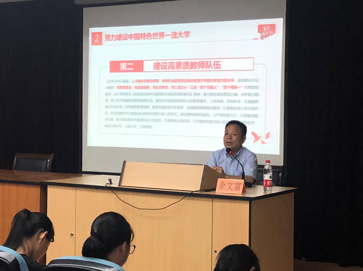 余文富以“新思想引领青年 习近平总书记在北京大学师生座谈会上讲话解读”为题,从“习近平总书记重要讲话的丰富内涵、精神实质”、“努力建设中国特色世界一流大学”、“广大青年师生勇担时代大任”、“肩负起国家和民族的希望”等四个章节,用通俗易懂、风趣幽默的语言,为广大师生详细解读了习近平总书记讲话的重要内涵,勉励广大青年教师做有理想信念,有道德情操,有扎实学识,有仁爱之心的学生引路人;勉励广大学生,用中国梦激扬青春梦、将青春梦融入中国梦,创造无愧于时代、无愧于历史的人生。