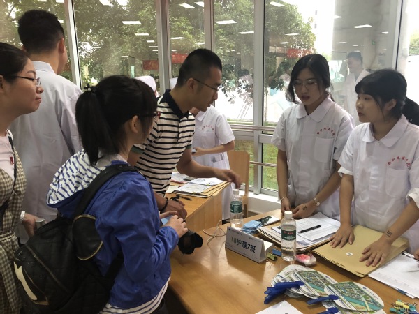 一向对护理专业感兴趣,但由于高考成绩不佳,与心爱的专业擦肩而过的黄同学,听说入学之后还有转专业的机会,向旁边的志愿者咨询何时可以提出转专业申请,如何提出申请等问题,得到了辅导员老师和志愿者们详细的解答。