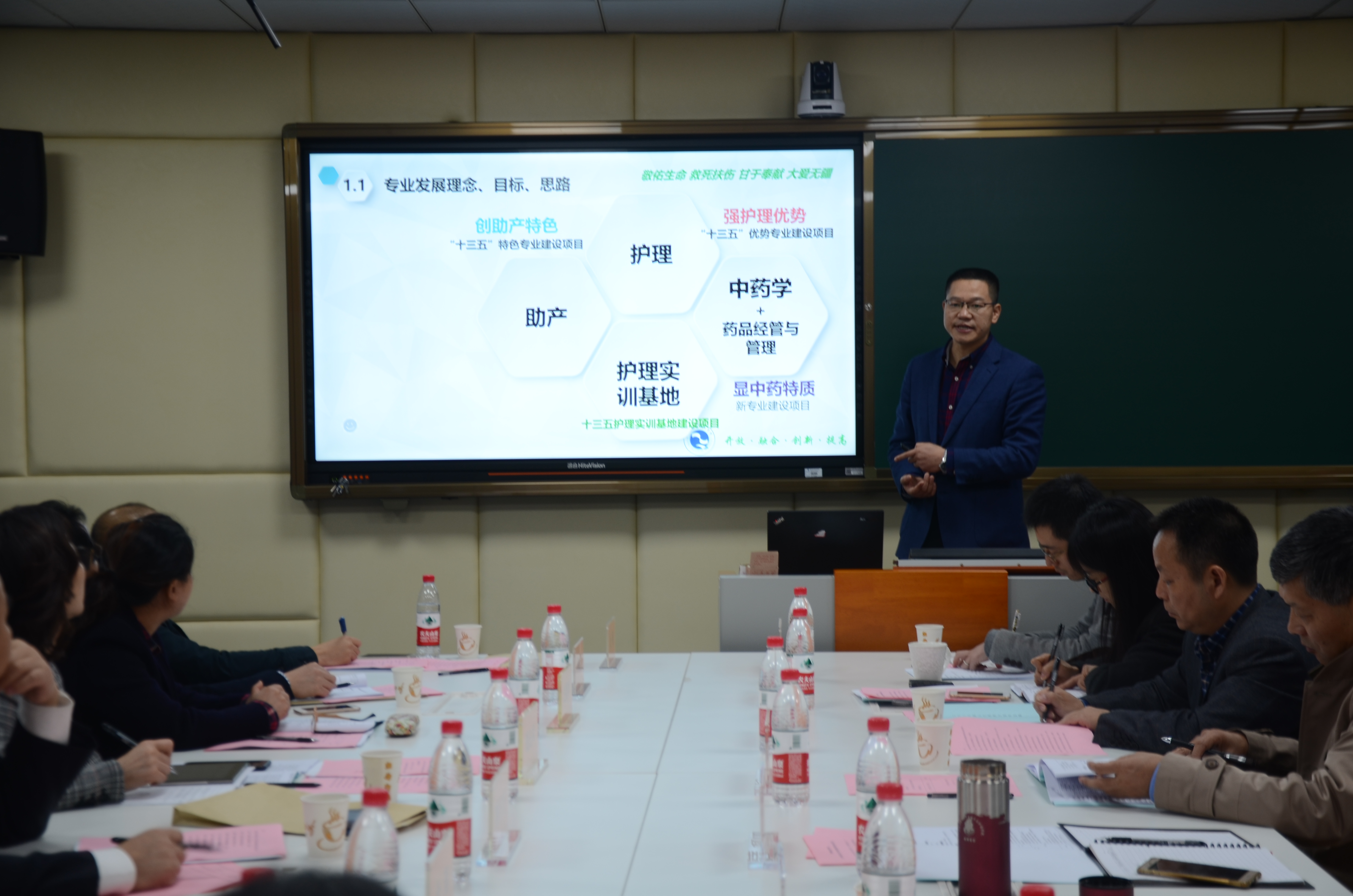 接下来的论证会由医药卫生大类专业建设指导委员会主任、衢州市人民医院副院长廖小方主持。专家们听取了由医学院院长姚水洪作的医学院“十三五”中期专业建设报告。报告分为中期工作总结、当前发展困境和“十三五”后期工作思考三个板块。在中期工作总结中,姚水洪在回顾过去工作成绩的基础上,指出当前面临的困境。为破解难题,姚水洪提出四点思路:一是推进“三全育人”与课程思政建设;二是重构健康服务类专业群;三是开展区域卫生职业教育与健康产业对话活动;四是优化健康服务类人才培养计划。