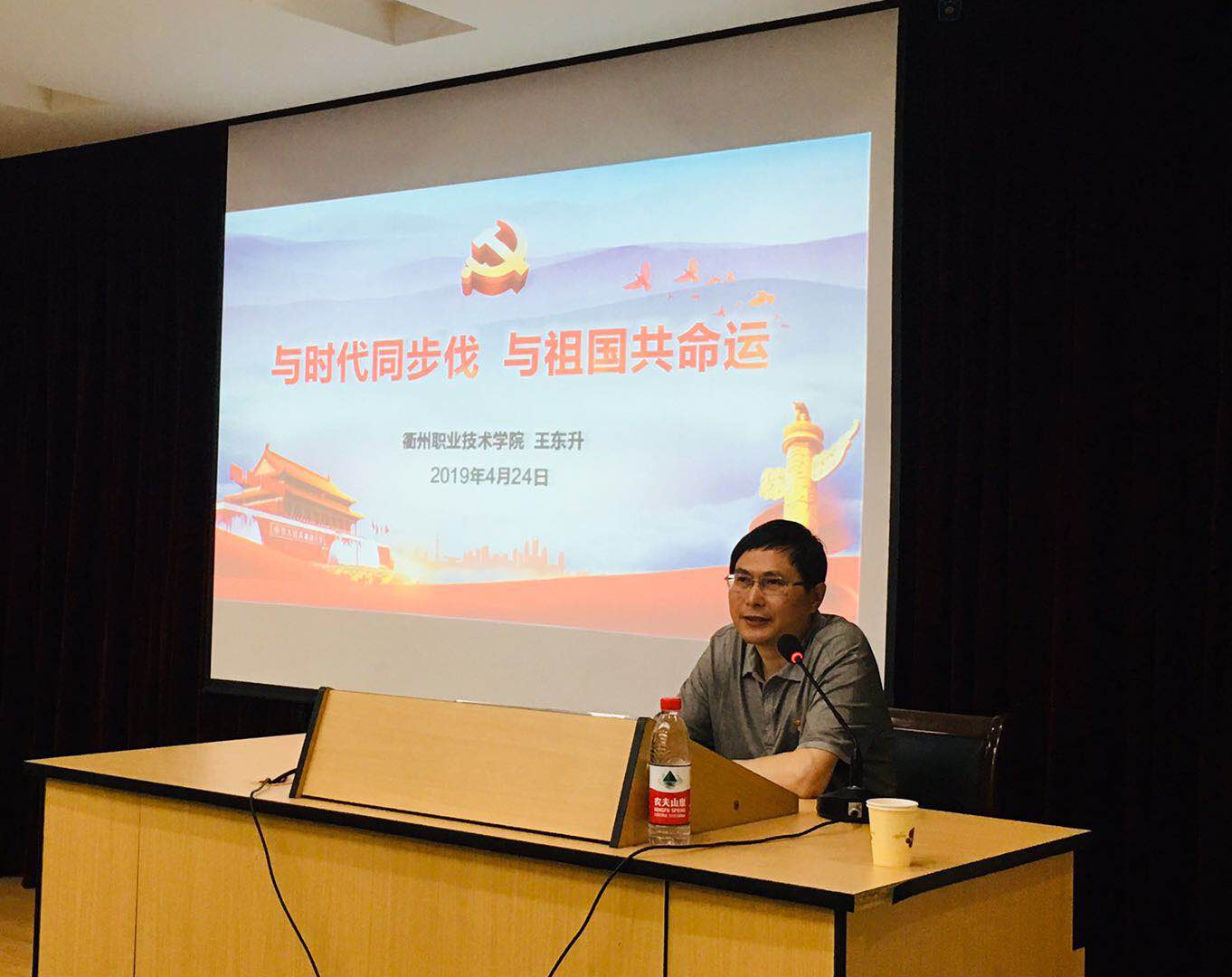 为了加强入党积极分子的培训教育,2019年4月24日下午16:00,机电工程学院党总支邀请校党委副书记王东升在图书馆三号报告厅为机电工程学院67名积极分子讲授了题为“与时代同步伐 与祖国共命运” 的主题党课。党课由机电工程学院党总支书记巫少龙主持。