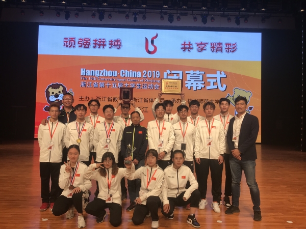11月10日,浙江省第十五届大学生运动会在杭州师范大学圆满收官,本次大运会我校共参加了排球、羽毛球、健美操、武术、游泳、田径六个竞赛项目和一个阳光项目,共获得奖牌20枚,其中金牌14枚,银牌5枚,铜牌 3枚。同时,以团体总分第三名的优异成绩评为“校长杯”获奖单位。校党委副书记、校长江爱民出席闭幕式,并上台领奖。