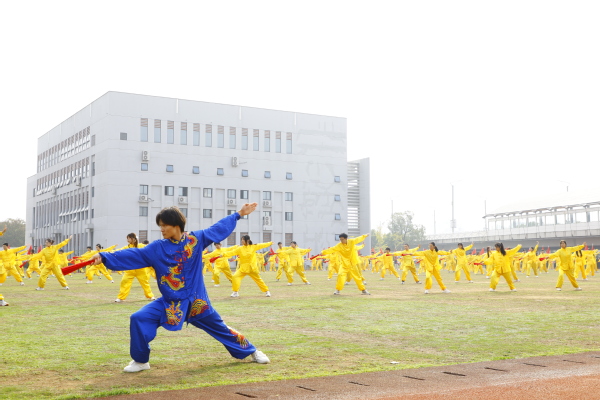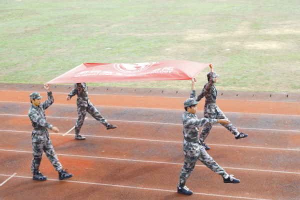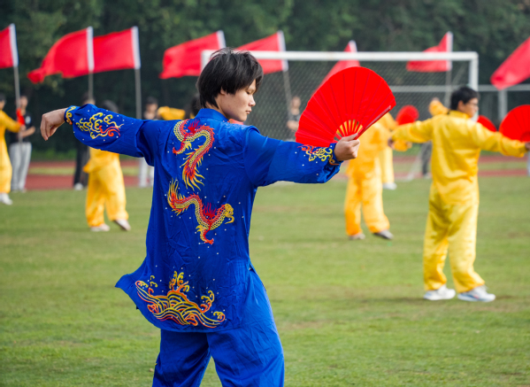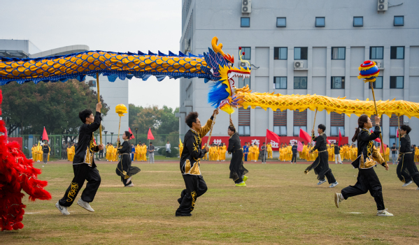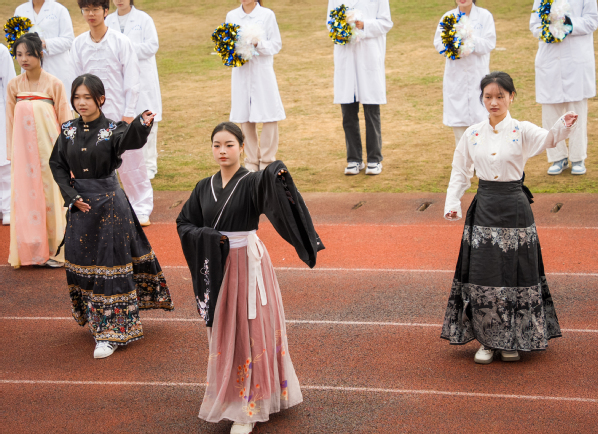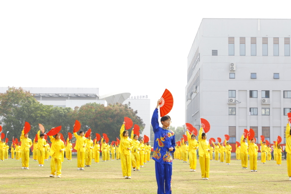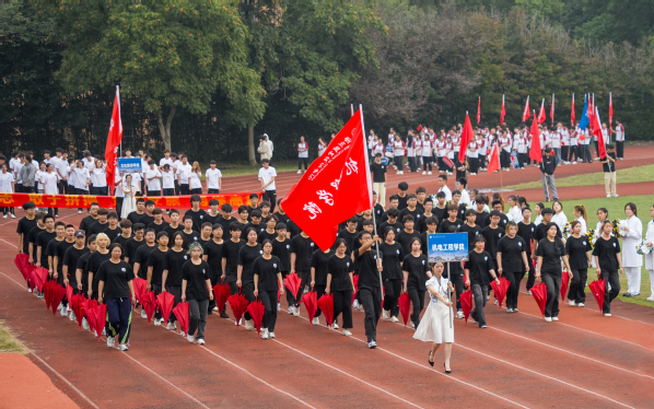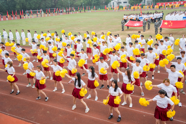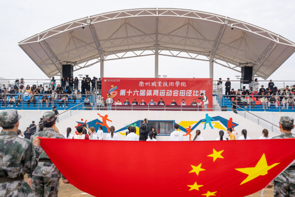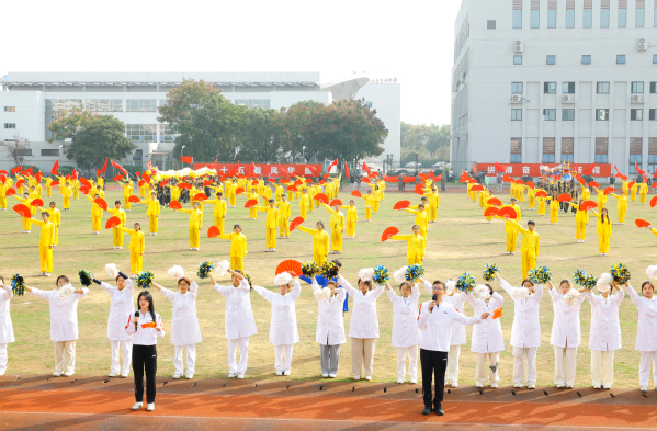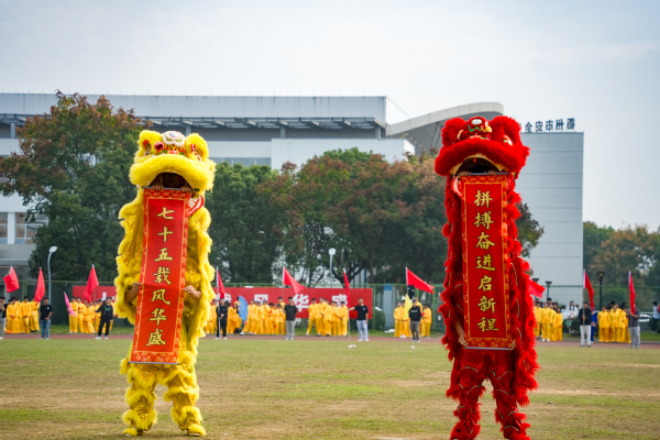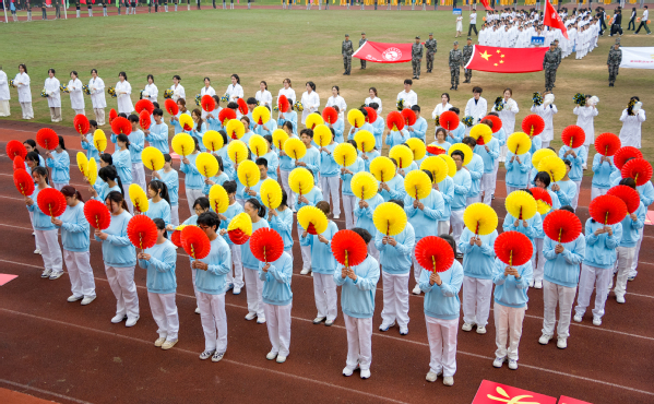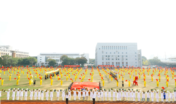 国旗队、校旗队、会旗队、彩球队及各二级学院方阵英姿飒爽地缓缓进入会场,龙狮、啦啦操、功夫扇、歌曲《我和我的祖国》充分展现了衢职院师生积极向上的精神面貌。