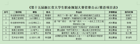 公示内容详见:《第十五届浙江省大学生职业规划大赛省赛公示/推荐项目表》